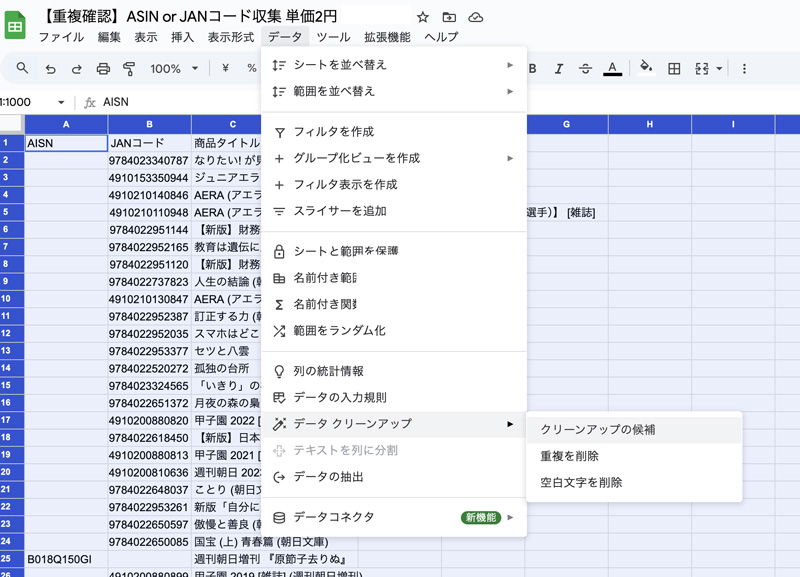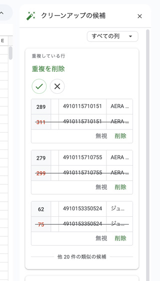 重複の確認 表計算ソフト 2025.12.152026.01.05 クリーンアップ機能を使ってシートに同一の内容がないかチェックします。 上部の [データ] > [データ クリーンアップ ] > [クリーンアップの候補] をクリックします。 重複が検出された場合サイドバーに[重複している行]が表示されます。 重複を削除の✓をクリックで重複データを削除できます。