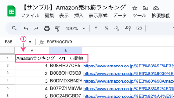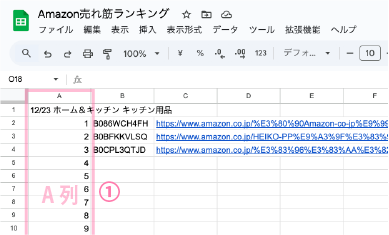 - 最初の行に「Amazonランキング 〇/〇(日付) カテゴリー名」と入力します。