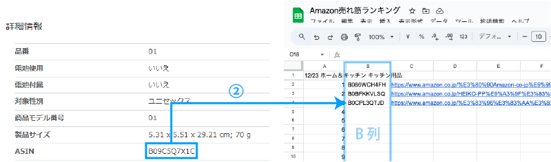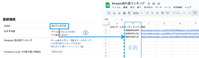 - 「ASINコード」②をコピーして「B列」に貼り付けます。