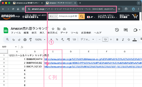 - 「URL」①をコピーして「C列」に貼り付けます。