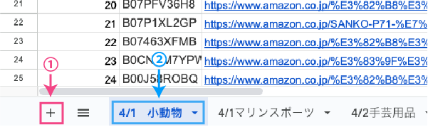 - 「+」①をクリックしてシートを追加します。